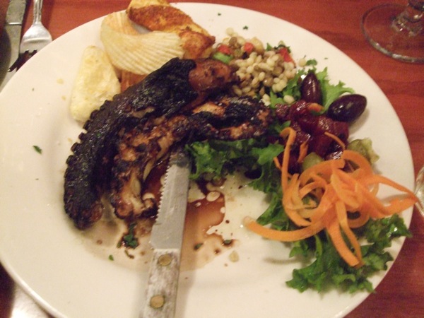 この店の得意料理の一つがグリルものだ。ハーブ、オイル、酢をつけて炭でグリルしたタコという文句に誘われて注文。食感が馴染みのない仕上がりになっている。香ばしくて美味しい。付け合わせの豆や穀物などもうまい。